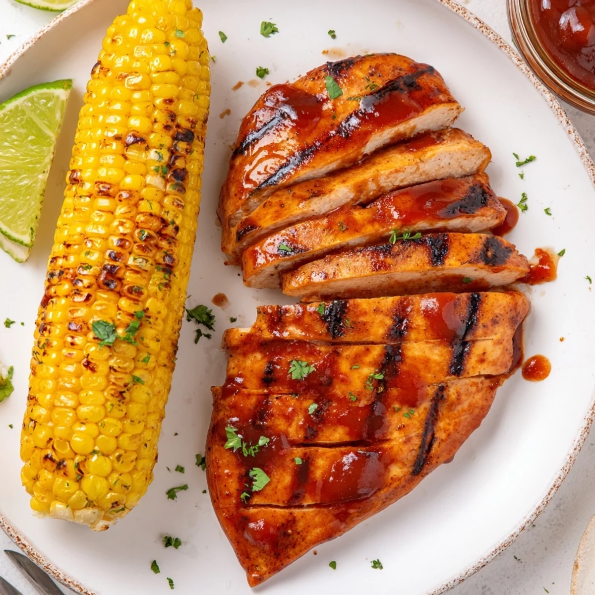 This smoky grilled chicken features boneless breasts rubbed with olive oil, smoked paprika, garlic and onion powders, then brushed with barbecue sauce during the final minutes for a glossy glaze. Corn on the cob is buttered and charred alongside the chicken for sweet, smoky kernels. Total time about 45 minutes; grill chicken 6–7 minutes per side to 74°C (165°F) and rest 5 minutes before slicing. Try chili flakes for heat or serve with potato salad or coleslaw.