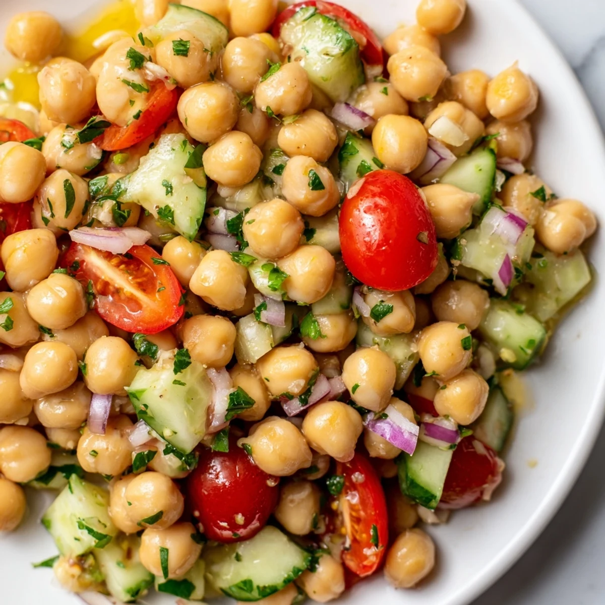 This vibrant Mediterranean-style salad brings together protein-rich chickpeas with crisp diced cucumber, sweet cherry tomatoes, and aromatic red onion. The bright herby lemon dressing features extra-virgin olive oil, fresh lemon juice, and a hint of garlic. Simply toss all vegetables together, whisk the dressing until emulsified, and combine just before serving. Ready in just 15 minutes with no cooking required.