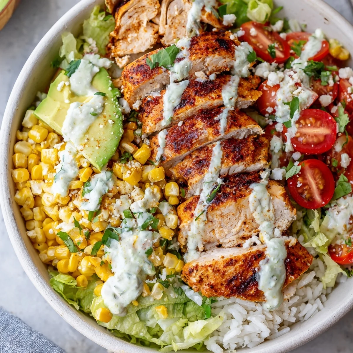 This satisfying bowl brings together the bold flavors of Mexican street corn with tender grilled chicken. The chicken gets a smoky spice rub with chili powder, smoked paprika, and cumin, then grilled until juicy. Fresh corn is roasted until slightly charred and tossed with spices, while a bright lime crema ties everything together. Serve over rice with crisp lettuce, creamy avocado, cherry tomatoes, and crumbled cotija for a complete, wholesome meal that's ready in under an hour.
